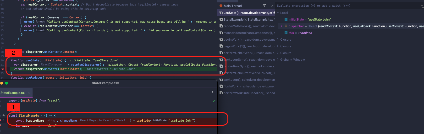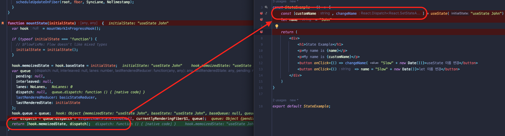 🤩 결국, useState가 반환하는 두번째 인자는 리액트가 등록한 event dispatch 함수이기 때문에 변경 감지시 렌더링 프로세스를 수행하는 것이다.