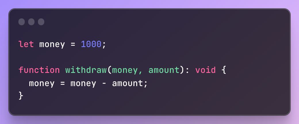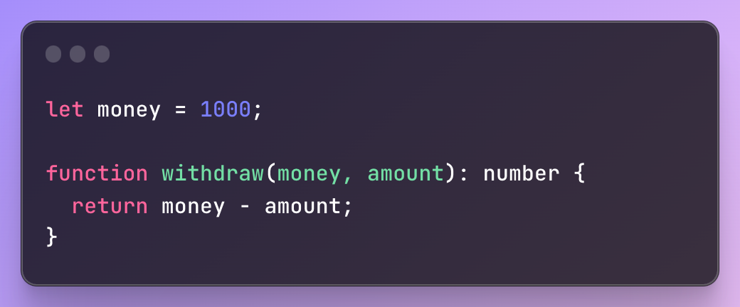 - 외부의 값을 수정하고 있다. 실무에서 수백줄의 코드가 하나의 파일로 되어있는 경우가 허다하다. 수백줄의 코드에서 값을 중구난방으로 수정하고 있는 코드를 수정해야 한다고 상상해보라. 그 코드를 수정했다한들 문제가 없을꺼라 확신 하기 힘들 것이다.