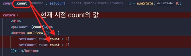 결국 setCount(count + 1) 호출시점에 count 에 할당되어 있는 값을 동일하게 주는것이다.