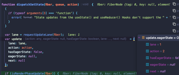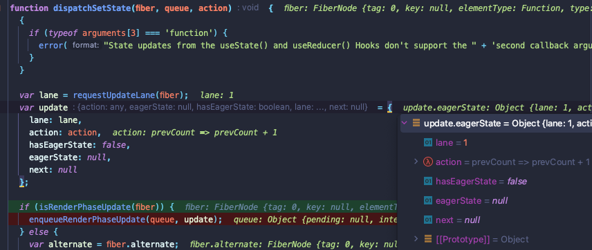 dispatchSetState 호출을 디버깅하보면, 해당 호출 **시점**에 넘겨준 값을 업데이트 객체에 넣는 것을 알 수 있다.