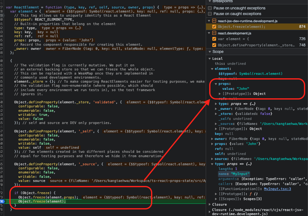 이유는 ReactElement 를 생성할때 props와 element 를 freeze해버리기 때문이다.