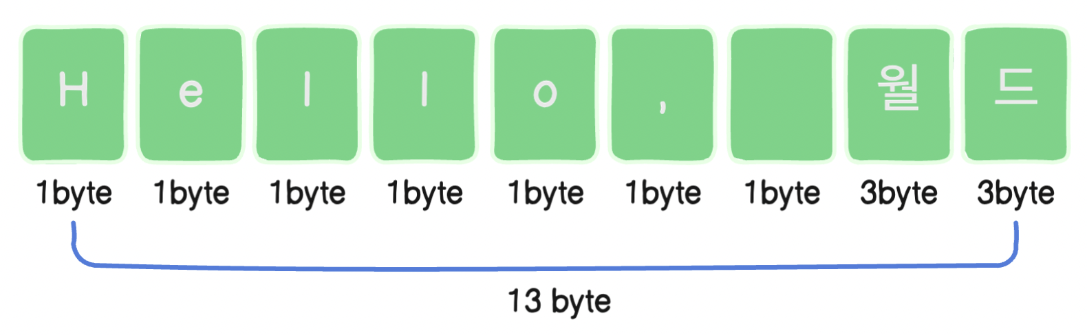 이처럼 한글은 3바이트 이기때문에 13바이트의 길이로 계산되어지는 것을 알 수 있어요.