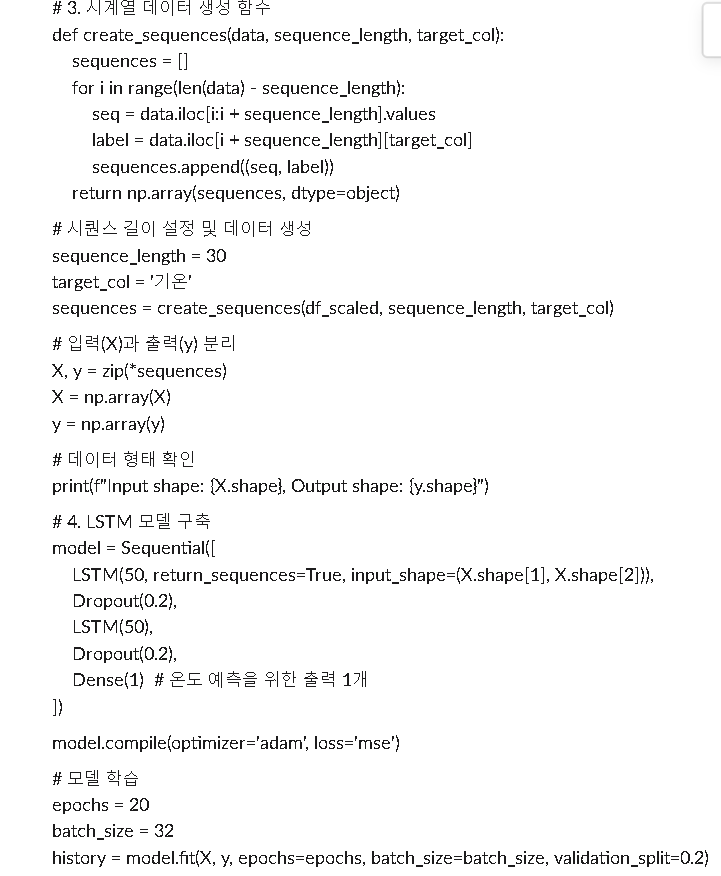 저희가 선택한 모델은 지난 30일간의 기온 데이터를 활용하여 다음 날의 기온을 예측하는 모델이었습니다.