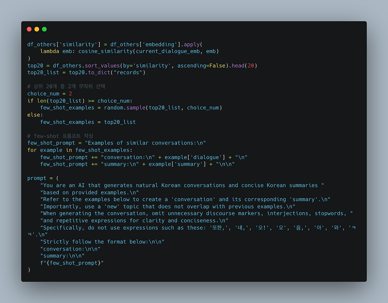 - Embedding 된 값을 활용하여 코사인 유사도를 통해 비숫한 대화를 Few-Shot으로 활용