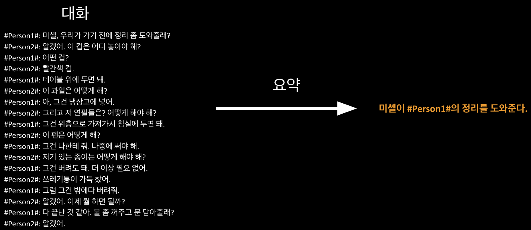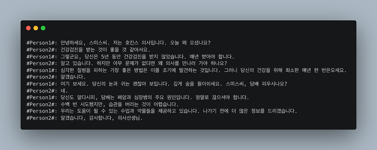 - 제공되는 데이터셋은 오직 "대화문과 요약문"