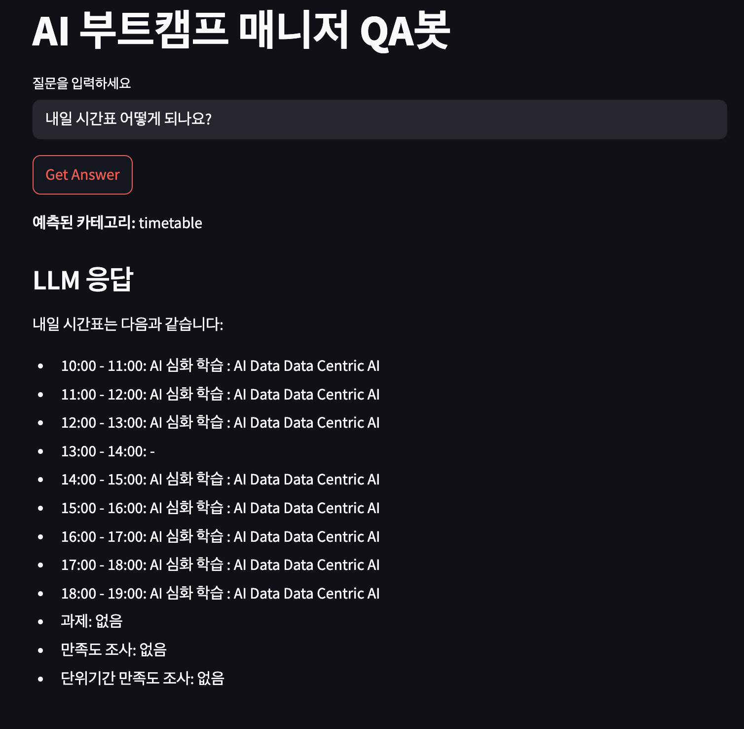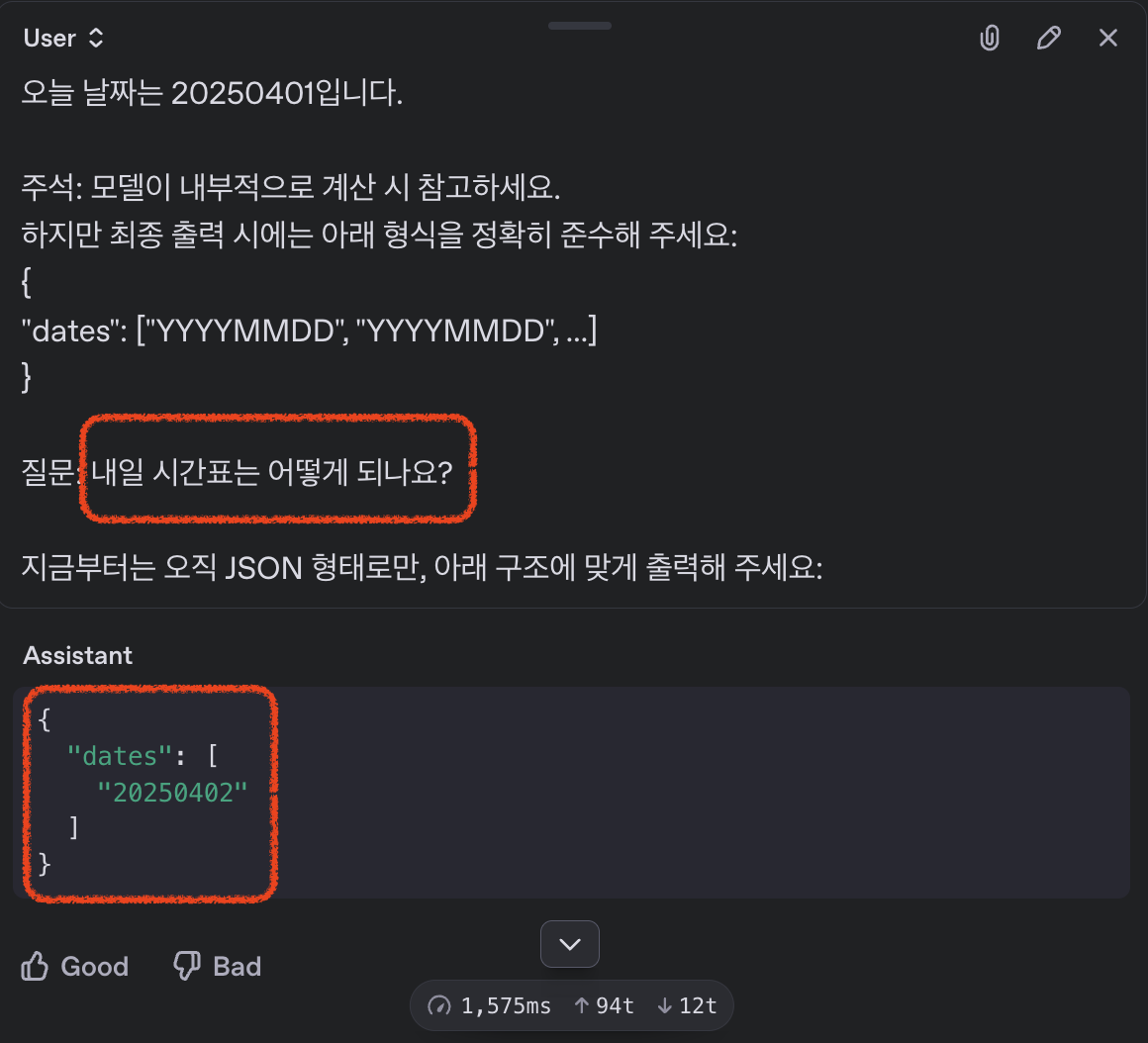 - "내일 시간표 어떻게 되나요?"와 같은 질문에서 발생할 수 있는 날짜 정보 이슈를 해결하기 위해 조회 대상 날짜를 명확히 하는 추가 프롬프팅을 도입했습니다.