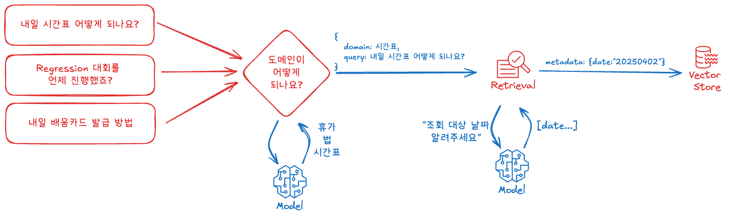 - 사용자의 질문을 분석하여 강의, 문서, 일정 등 적절한 도메인으로 자동 분류할 수 있도록 Routing 로직을 구축했습니다.
