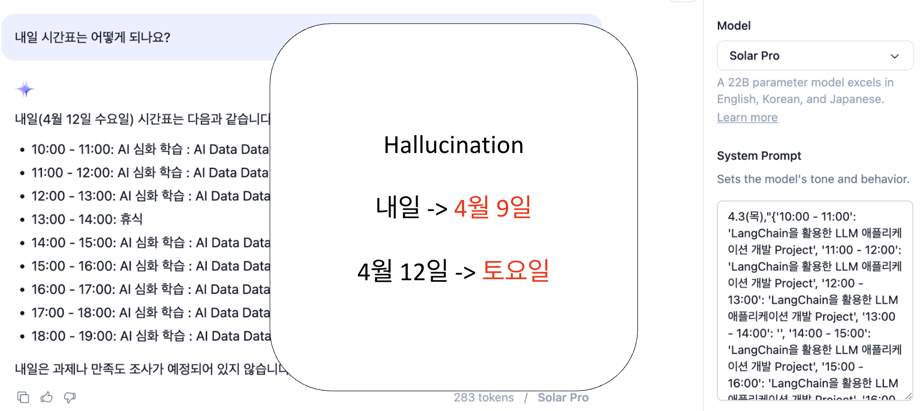 - Hallucination 현상을 방지하기 위해 반드시 컨텍스트에 현재 시간을 포함시키는 로직을 구현하였습니다.